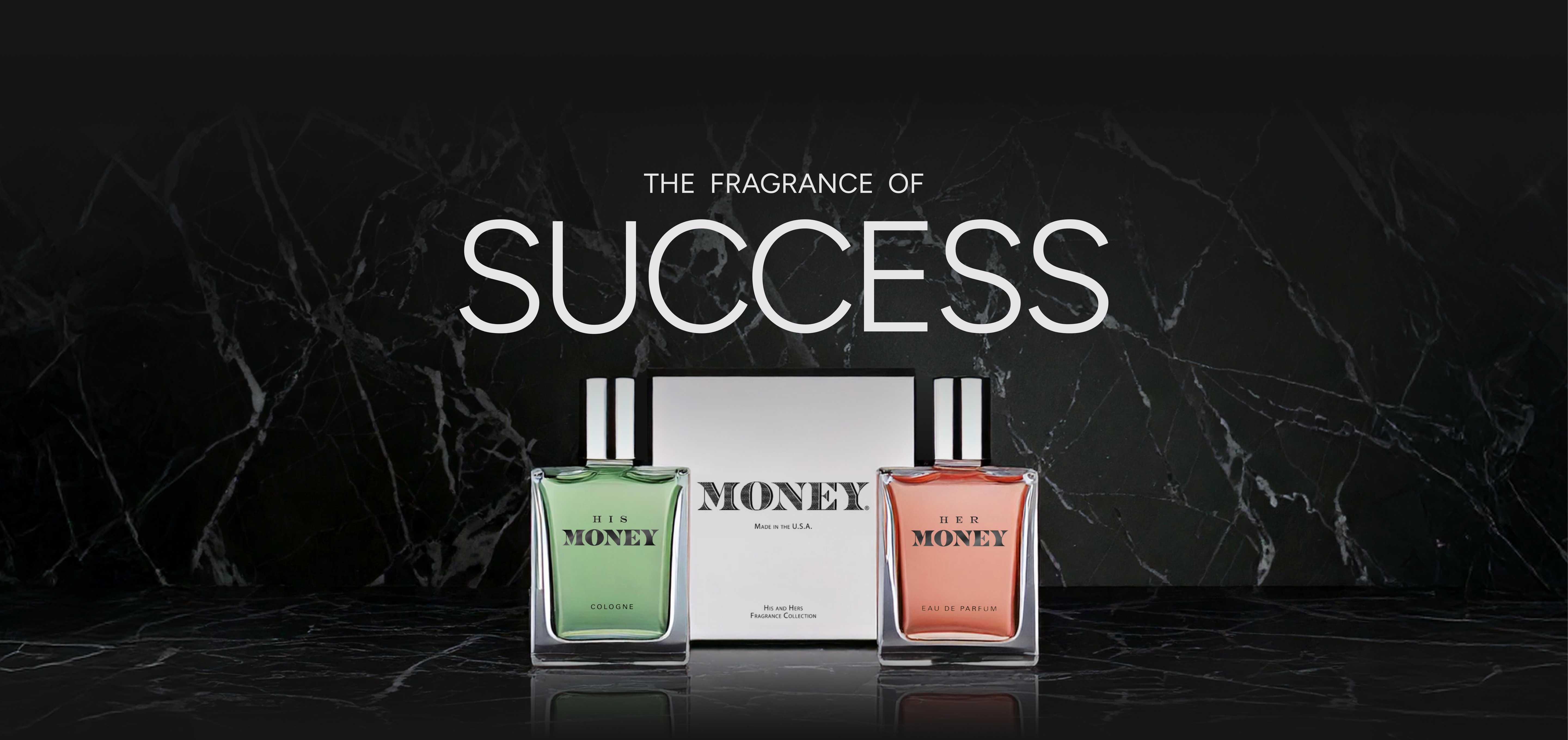 Two perfume bottles labeled 'His Money' and 'Her Money' with a box in the center on a white background.