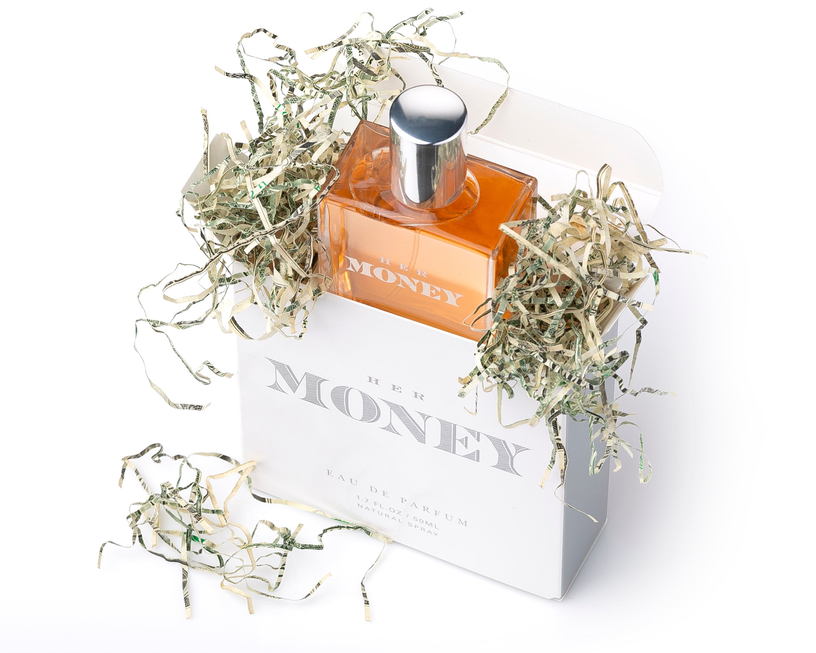 Delicately hand packed in real shredded United States dollar bills directly from the Federal Reserve Bank, Her Money is inspired by boundless spirit of floral and linen representing intricate detail, elegance and femininity. It begins with a light and airy touch, bursting with top notes of blackberry, grapefruit and pear. The heart is introduced with a bouquet of jasmine, lychee, and blue wisteria and a medley of white woods, musks, and coconut water create a delicate and feminine dry down.